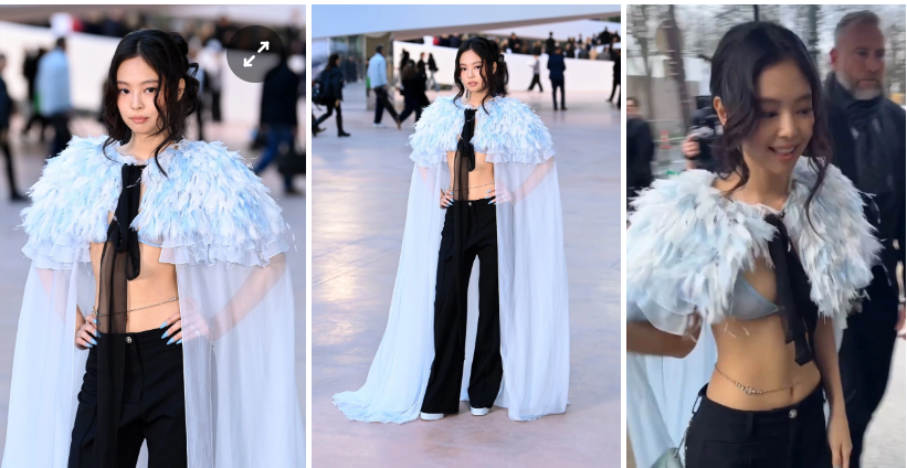 Ngày 29/1, Jennie tham dự show Chanel Haute Couture S/S 25 tại Paris với trang phục táo bạo. Nữ thần tượng lộ diện với mốt hở nội y. Cô chỉ khoác thêm áo choàng đính lông vũ cầu kỳ cùng quần ống dài. Trang phục gợi cảm giúp thành viên nhóm BlackPink khoe vóc dáng cân đối, vòng eo thon gọn.