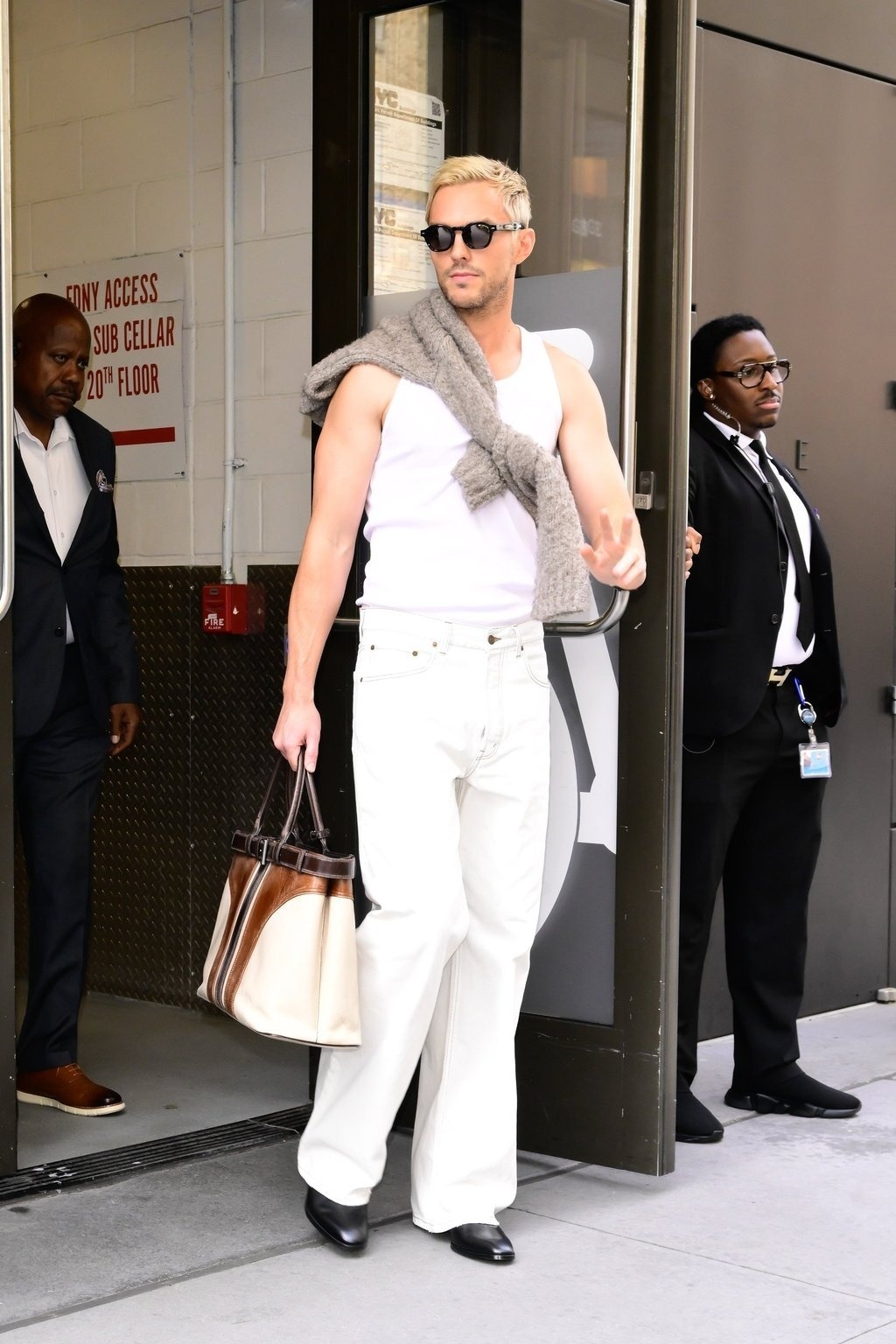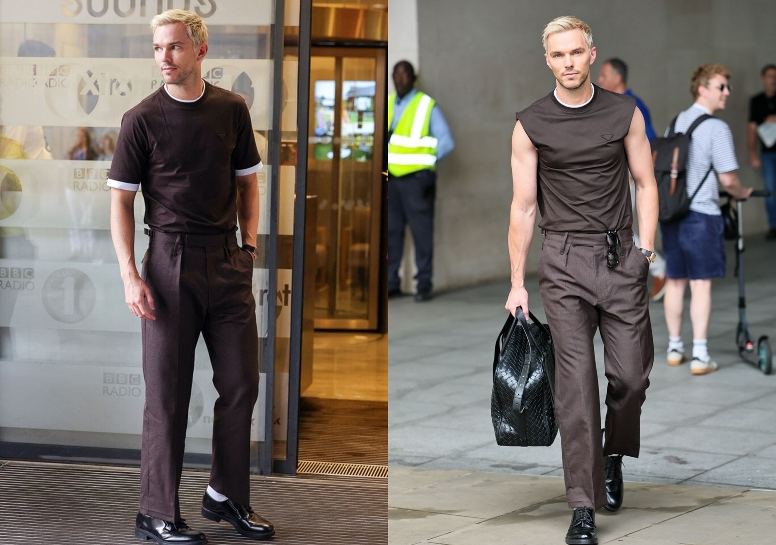 Kết thúc buổi phỏng vấn, tài tử xuống phố với cùng trang phục. Anh gập tay áo vào trong, biến T-shirts thành tank top, xách túi bowling cỡ lớn của Bottega Veneta. Chỉ cần thay đổi những chi tiết này, Nicolas Hoult trở nên tươi mới, trẻ trung hơn. Ảnh: GC Images