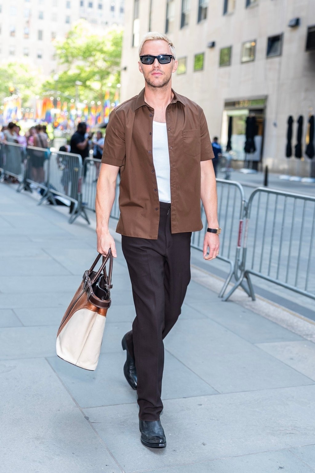 Hôm 30/6, Nicholas Hoult gây chú ý khi mặc ba bộ đồ ở New York. Đầu tiên, anh diện bộ vest Tom Ford màu nâu chocolate do Haider Ackermann thiết kế, áo dệt kim nâu nhạt. Ảnh: GC Images