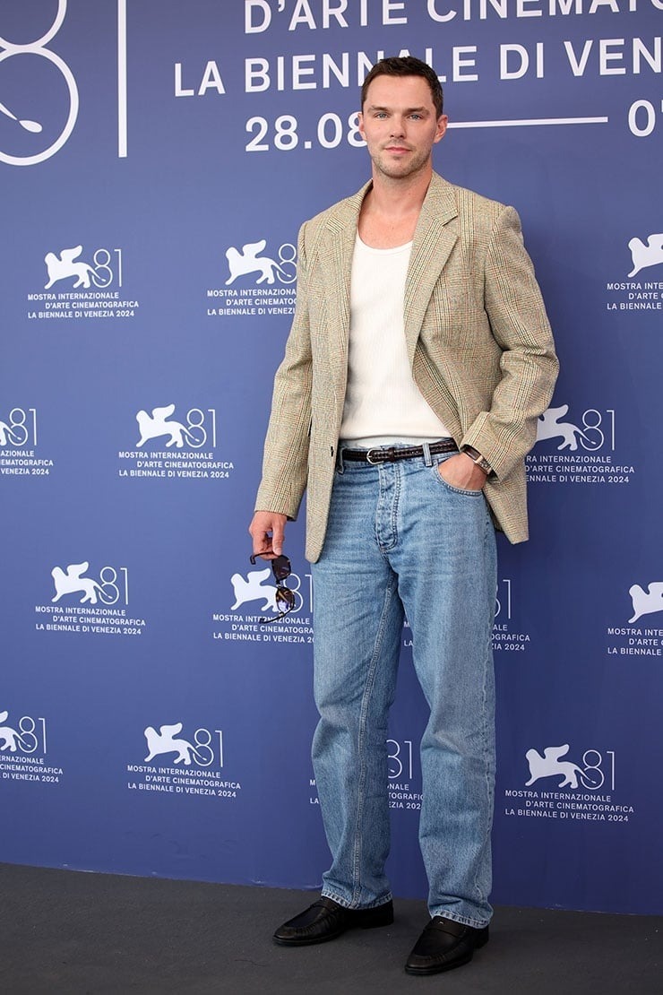 Nicholas Hoult thể hiện phong cách thoải mái nhưng vẫn tươm tất với blazer len của Bottega Veneta và quần jeans Ralph Lauren tại buổi ra mắt phim The Order tại Liên hoan phim Venice 2024. Ảnh: Celebmafia