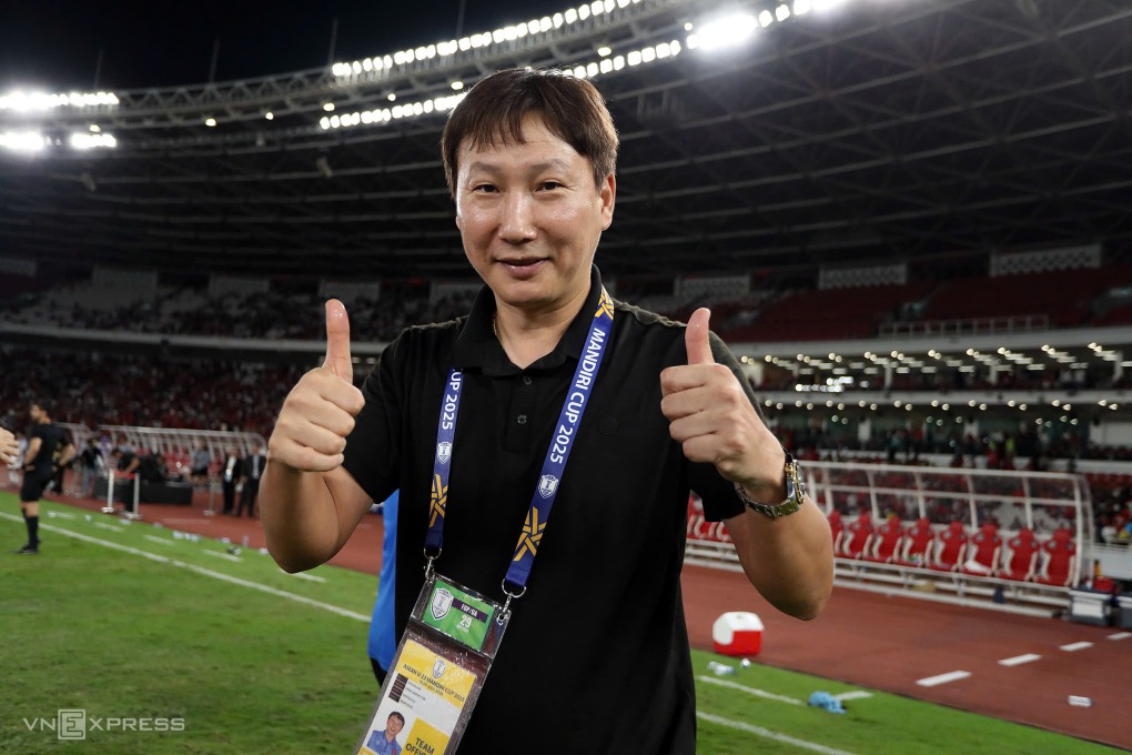 HLV Kim Sang-sik ăn mừng sau khi cùng Việt Nam đánh bại Indonesia 1-0 ở chung kết U23 Đông Nam Á tại sân Gelora Bung Karno, Indonesia ngày 29/7/2025. Ảnh: Hai Tư