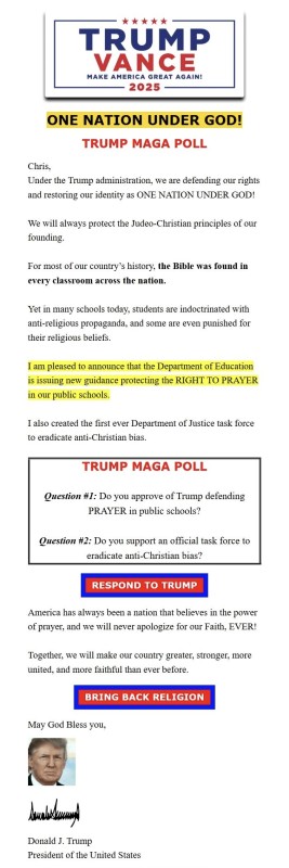 Một email gây quỹ gần đây từ Trump đặt trọng tâm chính trị của ông quanh đức tin, nhấn mạnh việc cầu nguyện trong các trường công lập và phản đối định kiến ​​chống Cơ đốc giáo. Thông điệp với chủ đề "Tôi luôn tin vào sức mạnh của lời cầu nguyện", nêu bật các sáng kiến ​​được cho là do chính quyền Trump thực hiện, bao gồm hướng dẫn mới của Bộ Giáo dục bảo vệ quyền cầu nguyện của học sinh và việc thành lập một lực lượng đặc nhiệm của Bộ Tư pháp nhằm giải quyết nạn phân biệt đối xử chống Cơ đốc giáo.