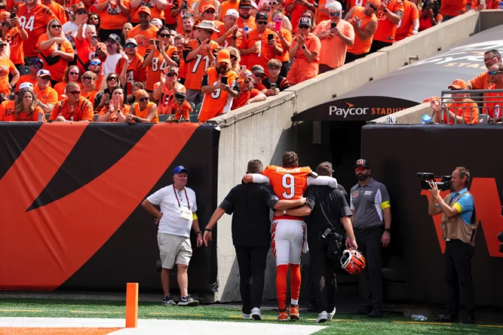 Giữa hiệp 2 trận gặp Jaguars, QB Joe Burrow rời sân vì chấn thương turf toe (tổn thương mô mềm/ dây chằng ở ngón cái bàn chân). HLV Zac Taylor xác nhận phẫu thuật; dù không đưa khung thời gian hồi phục, nhiều nguồn tin cho biết Burrow có thể nghỉ ít nhất 3 tháng—nghĩa là phần lớn mùa thường niên.