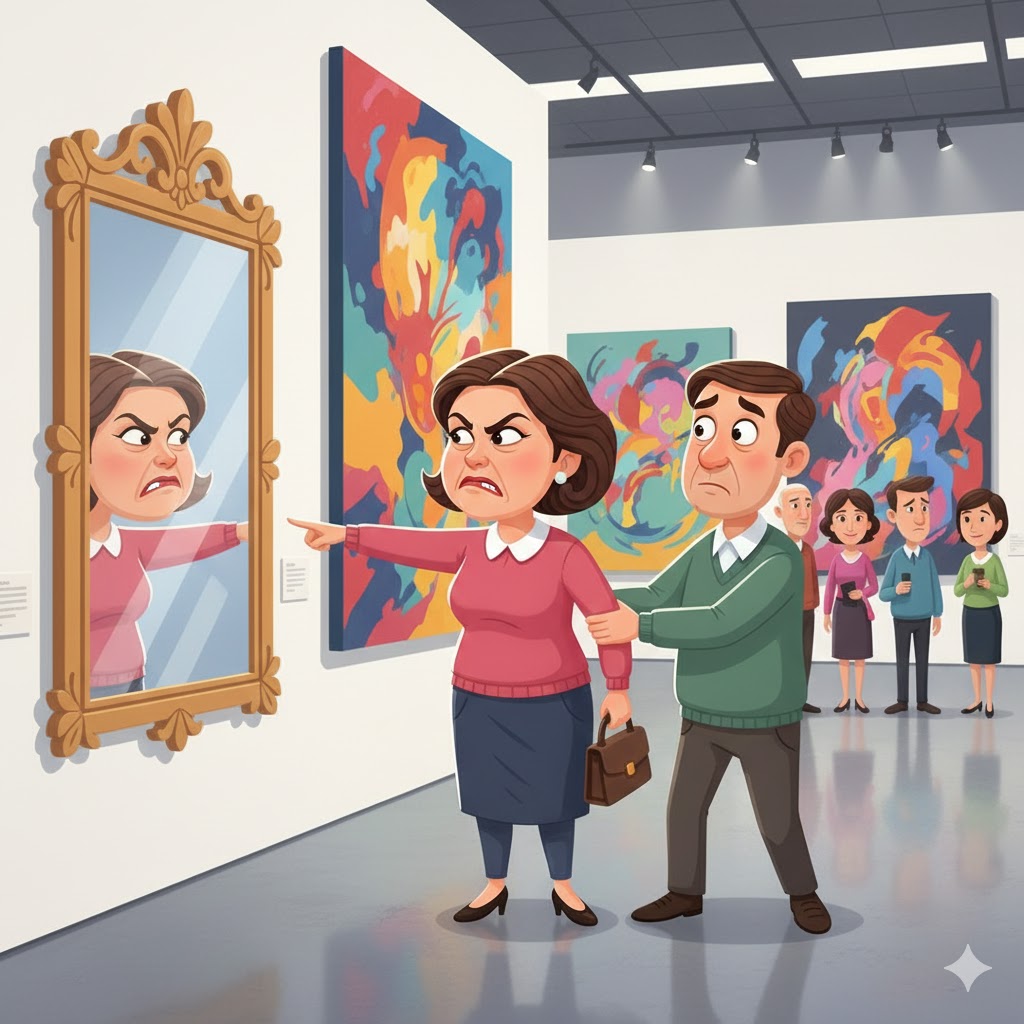 Bà vợ đứng hình. Khách tham quan xung quanh… cố nhịn cười. Còn cái gương thì… vẫn phản chiếu sự thật không thể chối cãi!