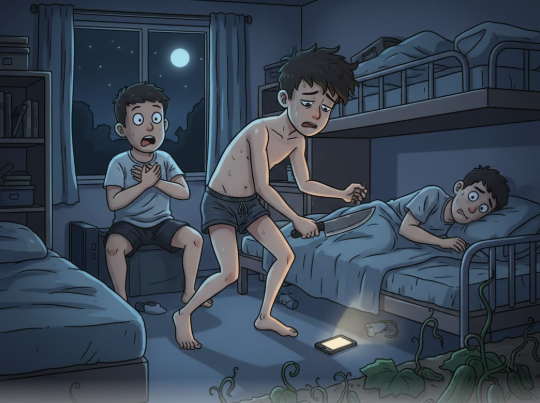 Nửa đêm trong phòng ký túc xá, mọi người không hiểu tại sao một cậu con trai cứ cầm con dao đi khắp phòng sờ soạng "của quý" của mọi người rồi về giường ngủ tiếp.