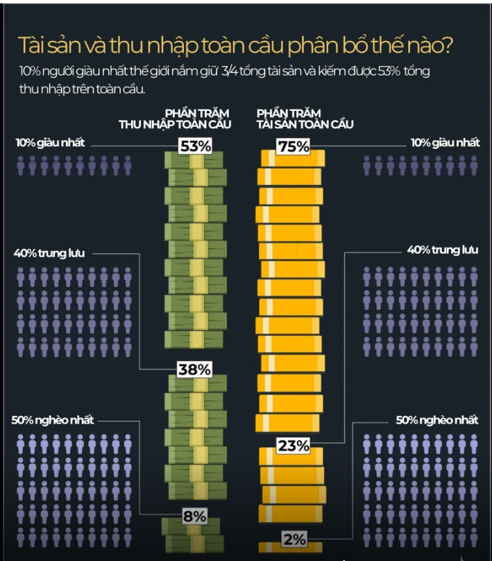 Năm 2025, 10% người giàu nhất thế giới mang về 53% tổng thu nhập toàn cầu, 40% người thu nhập trung bình nhận 38%, và 50% người nghèo nhất chỉ kiếm được 8%.
