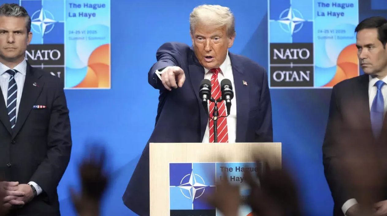 Tổng thống Mỹ Donald Trump tại thượng đỉnh NATO ở La Haye, Hà Lan, ngày 25/06/2025, bên phải là bộ trưởng Quốc Phòng Pete Hegseth, bên trái là ngoại trưởng Marco Rubio. AP - Markus Schreiber