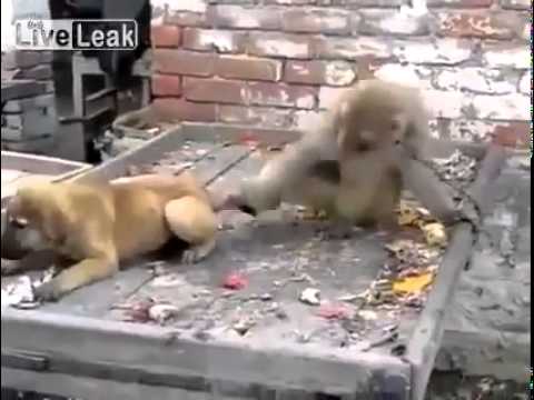 Đoạn clip hài hước cho thấy con khỉ láu cá liên tục giật đuôi, tát vào mặt chó sau đó nhảy xuống khiến chó tức điên lên mà không có cách nào trả đũa.