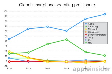 Theo phân tích của hãng nghiên cứu thị trường Canaccord Genuity (Canada), hiện Apple là hãng smartphone xếp thứ 2 về doanh số, với 14,5% thị phần trên thị trường smartphone (48 triệu máy được bán ra), tuy nhiên “quả táo” lại nắm giữ đến 94% lợi nhuận của toàn thị trường trong quý III/2015, tăng mạnh so với mức lợi nhuận 85% mà hãng đã nắm giữ trong cùng kỳ năm ngoái.
